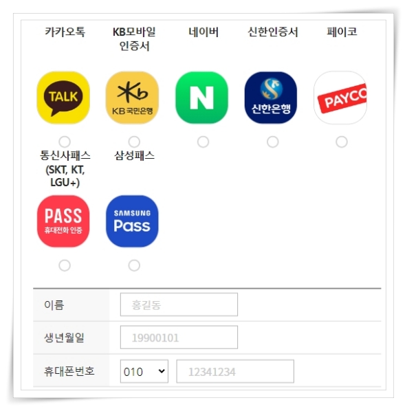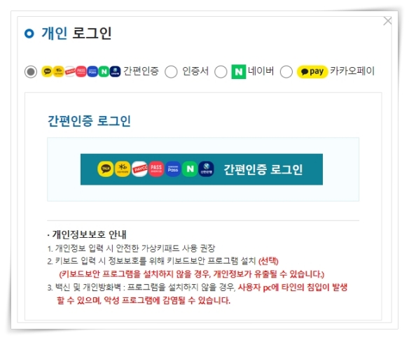 2. 간편인증 방식에서 카카오톡, 네이버, 패스 등 인증 방식을 선택해 주세요.