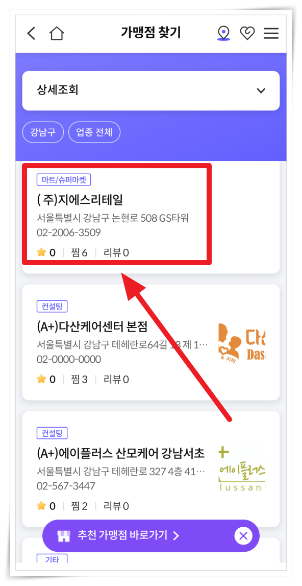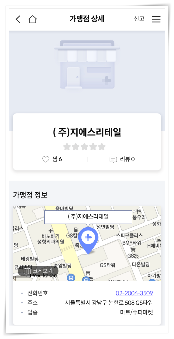 4. 검색 결과에서 사용처를 클릭하면 위치, 연락처, 업종을 확인하실 수 있습니다.