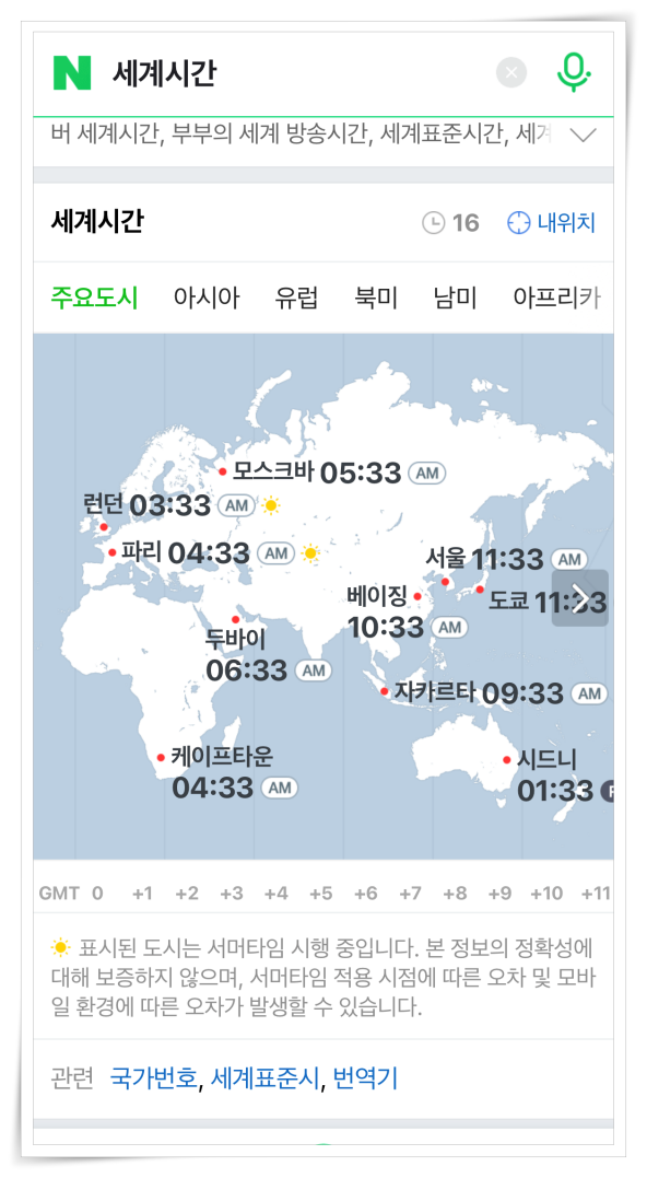 마지막으로 세계시가는 전세계 주요 도시의 현재 시간을 확인하실 수 있습니다.