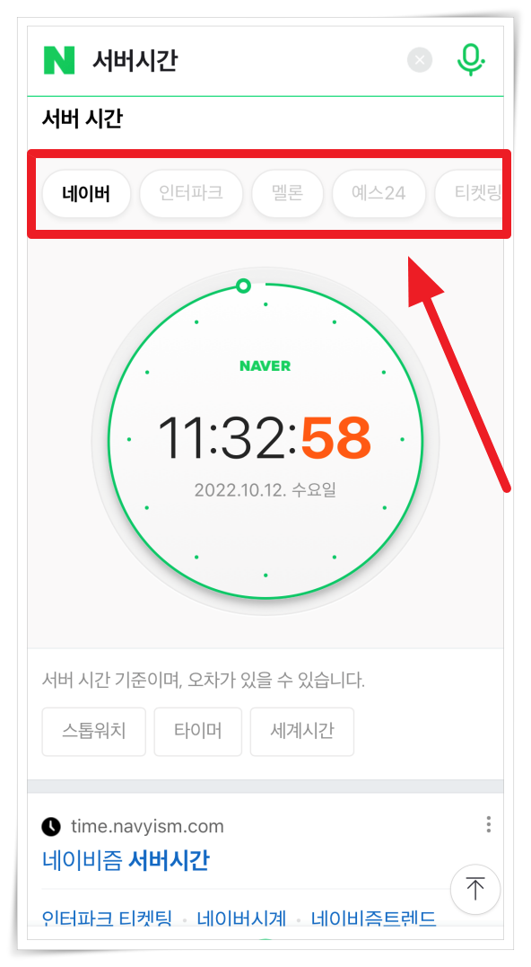 서비시간 기능은 예매할 때 정말 유용한데요. 상단 메뉴에서 인터파크, 멜론, 예스24 등 예매처를 선택하면 정확한 서버시간을 확인하실 수 있습니다.
