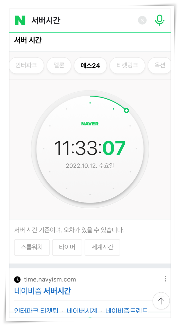 서비시간 기능은 예매할 때 정말 유용한데요. 상단 메뉴에서 인터파크, 멜론, 예스24 등 예매처를 선택하면 정확한 서버시간을 확인하실 수 있습니다.