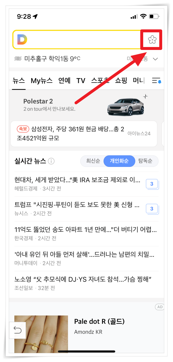 1. 다음 앱 설치 후 검색 창 우측 아이콘을 클릭해 주세요.
