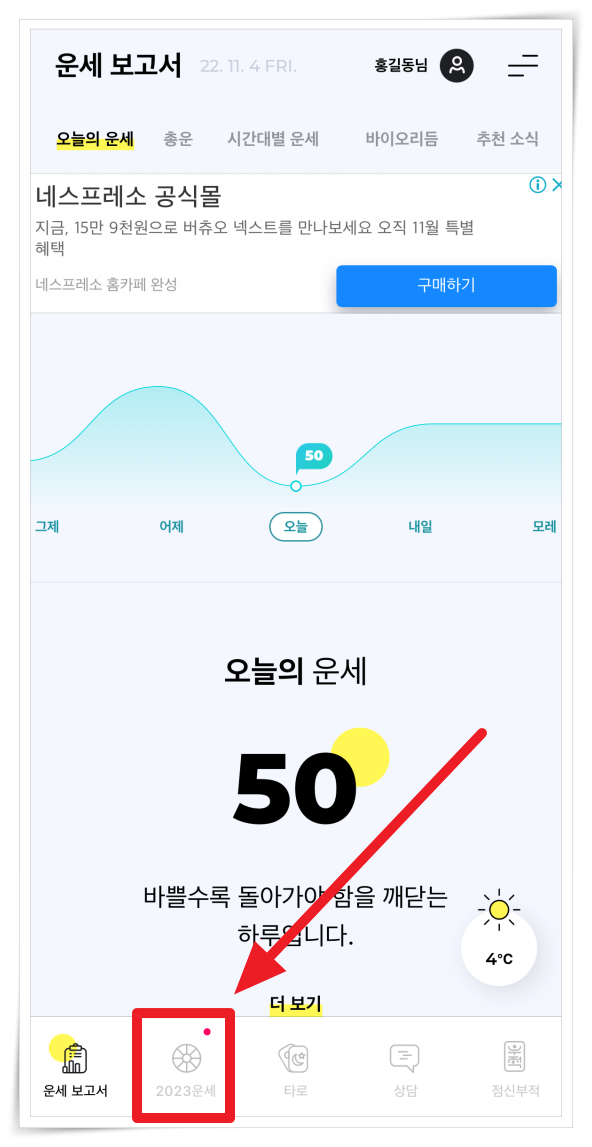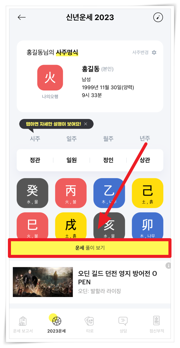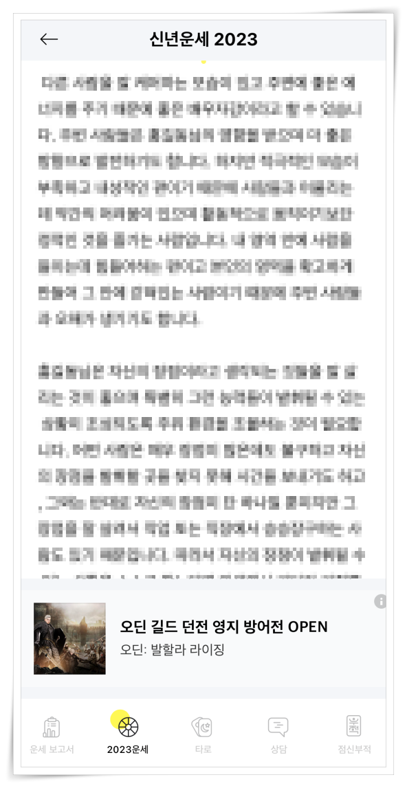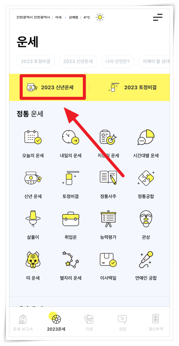 2. 하단 메뉴에서 "2023 운세"를 찾아 클릭해 주세요.