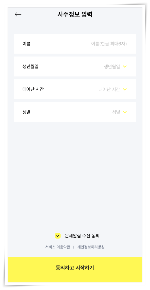 1. 앱 설치 후 이름, 생년월일, 태어난 시간, 성별 등 사주 정보를 입력해 주세요.