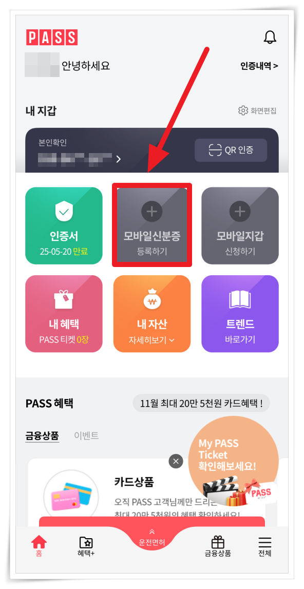 1. 패스 앱 설치 후 중앙 메뉴에서 "모바일 신분증"을 클릭해 주세요.