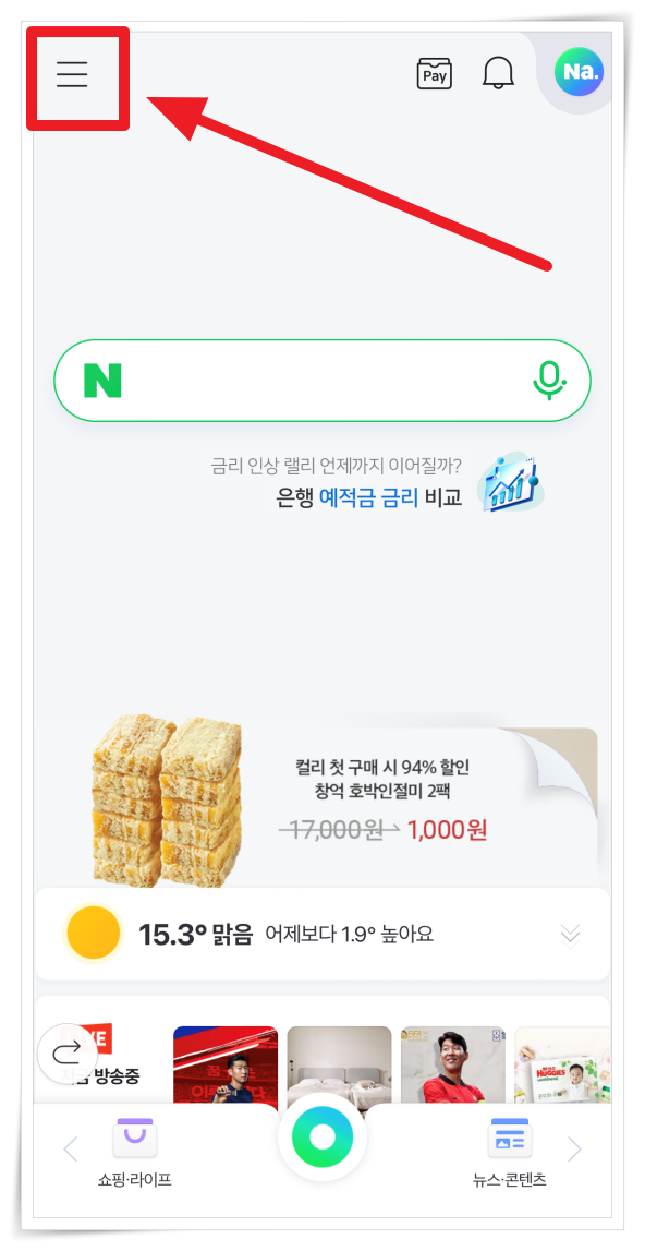 1. 네이버 앱 실행 후 좌측 상단 전체 메뉴를 클릭해 주세요.