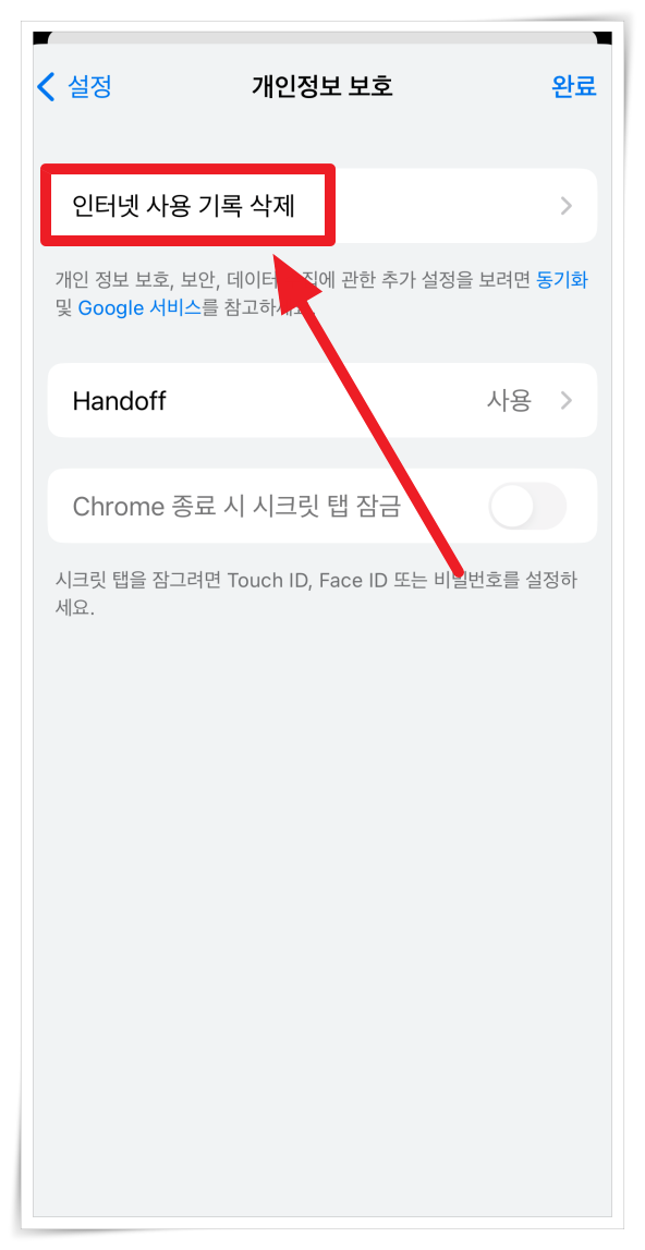 3. 개인정보 보호에서 "인터넷 사용 기록 삭제"를 클릭해 주세요.