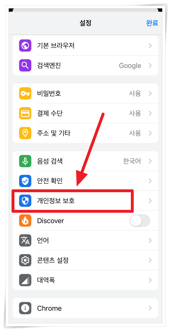 2. 설정에서 "개인정보 보호"를 클릭해 주세요.
