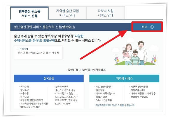 1. 행복출산 원스톱 서비스에서 "신청"을 클릭해 주세요.