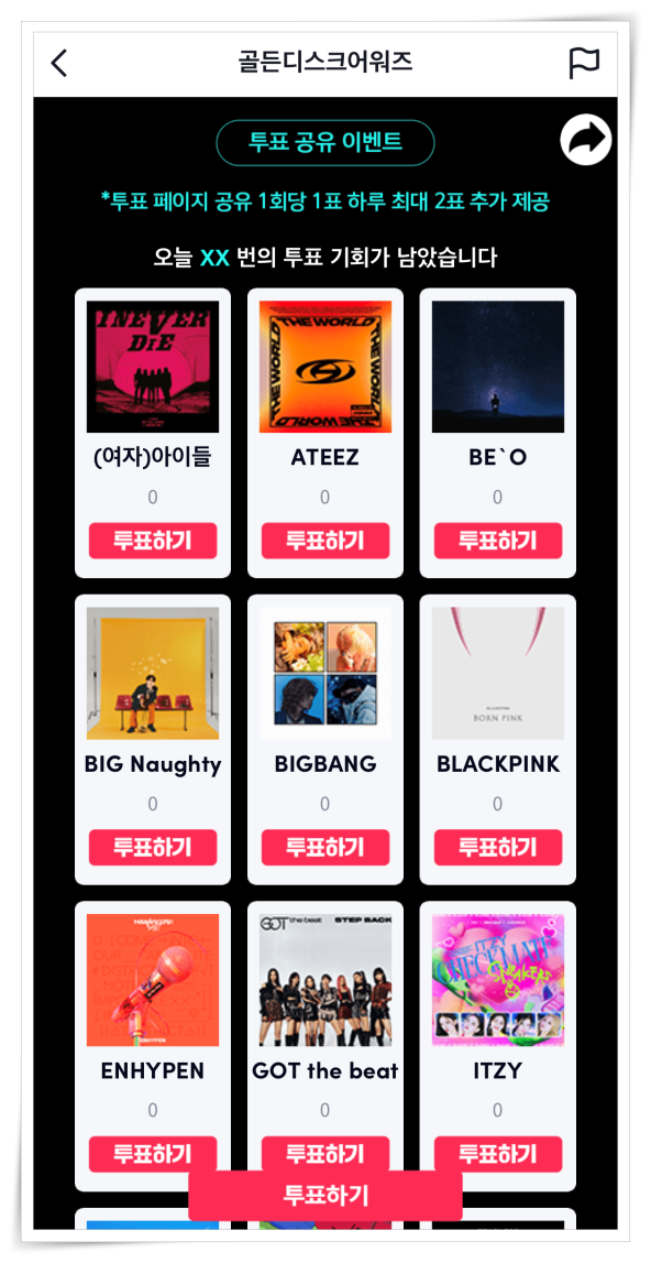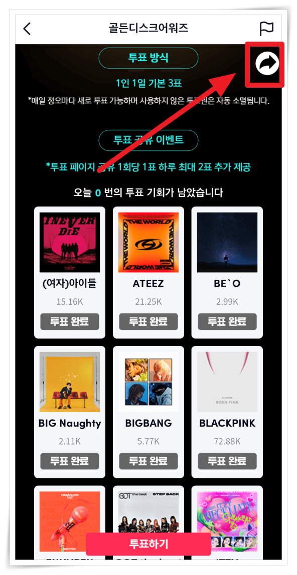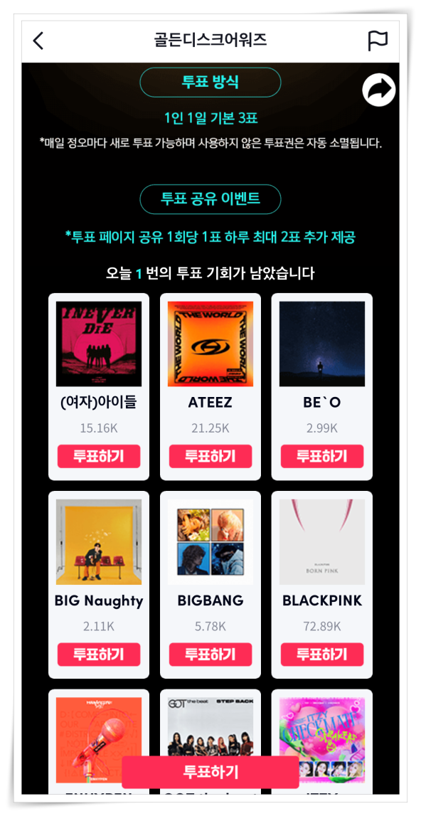 인기상 투표 방법은 공식 앱에서 하루 3회 참여가 가능합니다. 여기에 공유를 통해 추가로 2회 찬스를 얻으실 수 있어요.