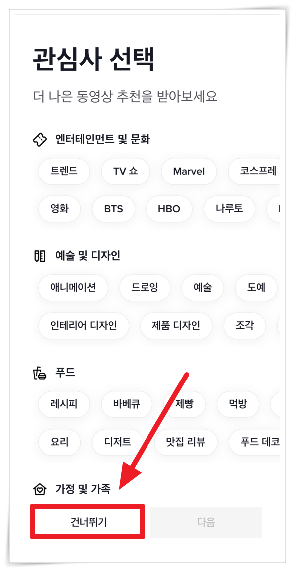 1. 공식 앱 설치 후 관심사 선택에서 "건너띄기"를 클릭해 주세요.