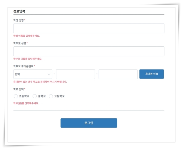 3. 학생, 학부모, 휴대폰번호, 학교 선택을 입력해 주세요.