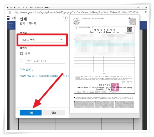 8. 프린터 설정에서 "PDF로 저장" 선택 후 "저장"을 클릭하면 다운받으실 수 있습니다.