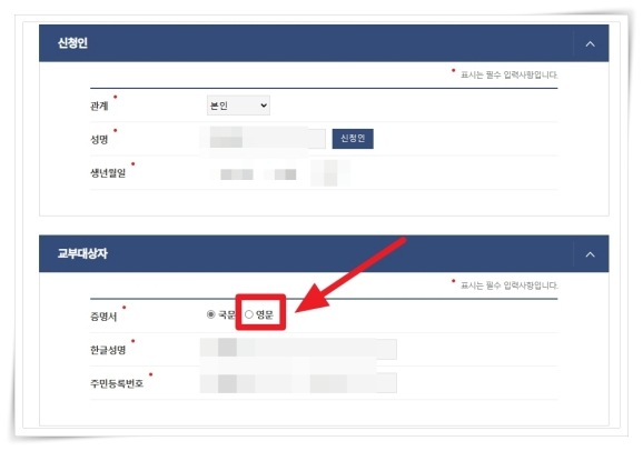 5. 교부대상자에서 "영문" 증명서를 선택해 주세요.