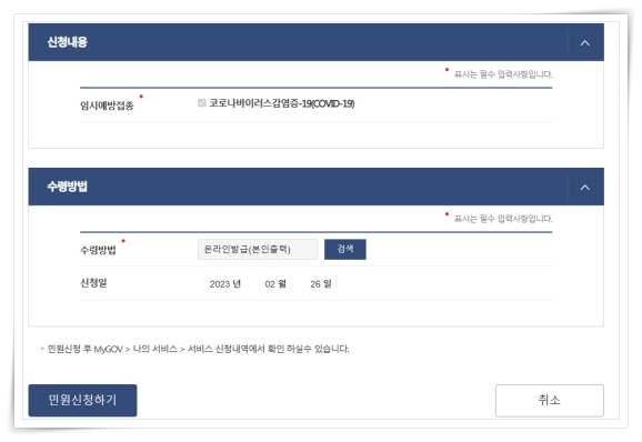 6. 신청 내용과 수령 방법 선택 후 "민원신청하기"를 클릭해 주세요.
