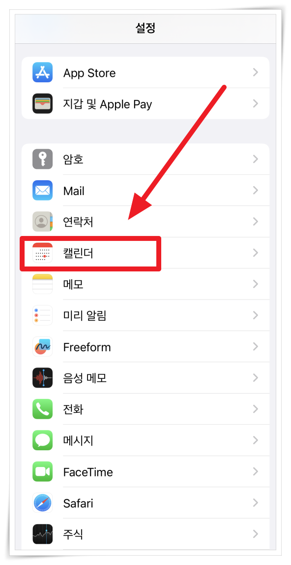1. 아이폰 설정에서 "캘린더"를 찾아 클릭해 주세요.