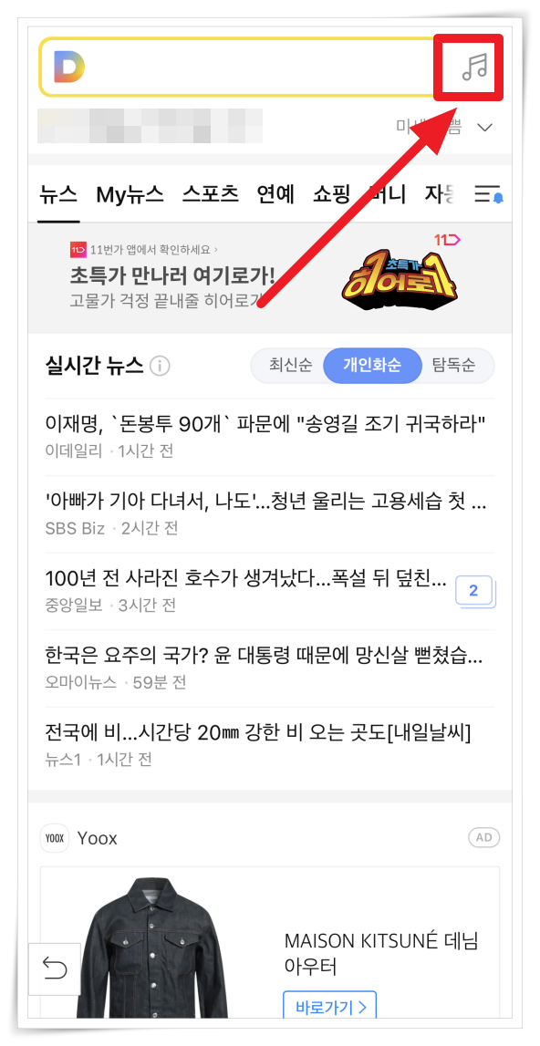 1. 다음 앱 설치 후 우측 상단 "음표" 아이콘을 클릭해 주세요.