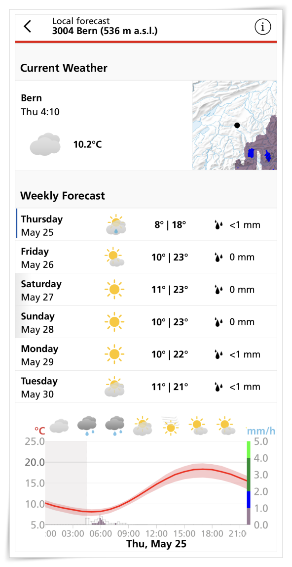 그리고 여행에 있어서 중요한 것은 현지 온도와 날씨이죠. 사람이 활동하기 좋은 기온이 19~27도 사이라고 하는데요. 스위스 체감온도가 그 사이일 때는 5월 ~ 9월입니다. 이 시기가 스위스 여행하기 가장 좋은 게정이라고 할 수 있습니다. 그리고 현재의 날씨와 온도 정보를 확인하고 싶다면 앱을 통해 쉽게 알아보실 수 있어요.
