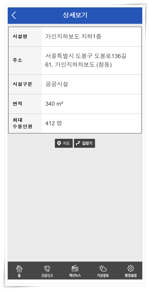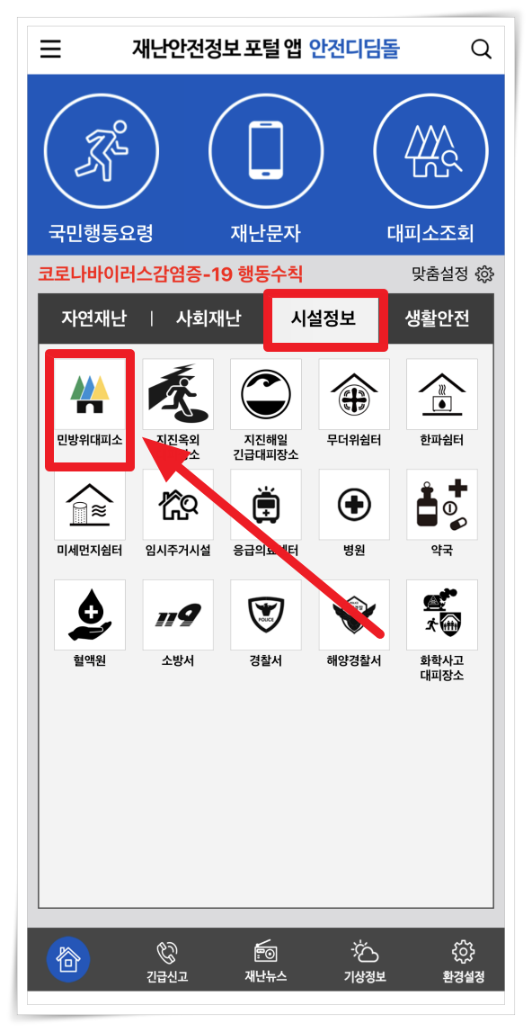 1. 앱 설치 후 "시설정보" > "민방위대피소"를 클릭해 주세요.