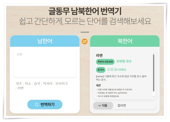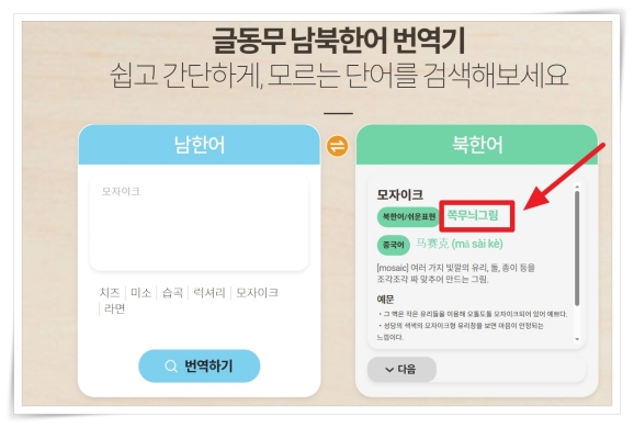 남북한어를 쉽고 간단하게 번역할 수 있는 방법이 있는데요. "글동무"는 남한어 단어를 입력하면 북한어로 변환해 줍니다.
