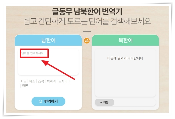 남북한어를 쉽고 간단하게 번역할 수 있는 방법이 있는데요. "글동무"는 남한어 단어를 입력하면 북한어로 변환해 줍니다.