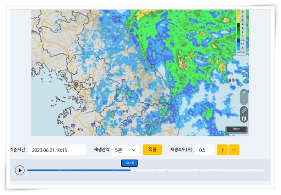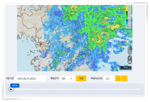 3. 지도 하단 플레이 버튼을 클릭하면 5분간격으로 비구름의 이동 방향을 확인하실 수 있습니다.