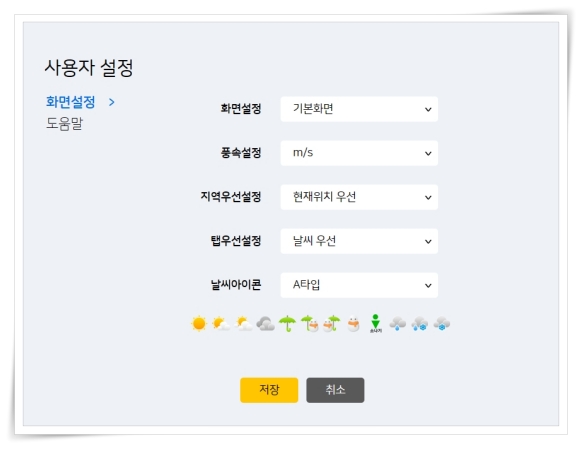 4. 이밖에 사용자 설정으로 풍속, 지역, 날씨 아이콘 등을 변경하실 수 있어요.