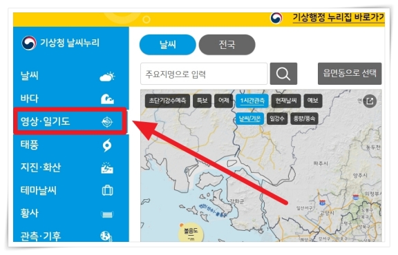 1. 홈페이지 좌측 메뉴에서 "영상 / 일기도"를 클릭해 주세요.