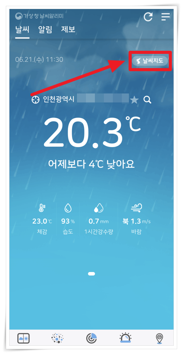 2. 첫 화면 우측 상단 "날씨 지도"를 클릭해 주세요.