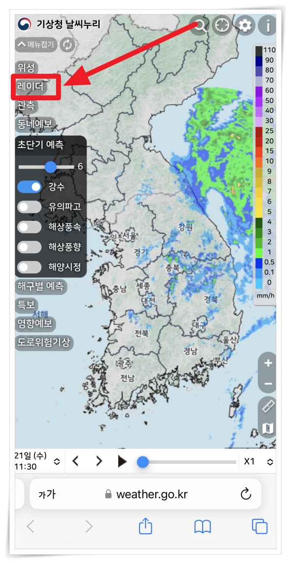 3. 좌측 메뉴에서 "레이더"를 선택하면 비구름을 확인하실 수 있습니다.