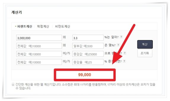 1. 계산하기 번거럽다면 퍼센트 계산기를 통해 확인이 가능합니다. 전체값에 임금을 넣고 비율값에 3.3%를 입력하고 계산을 눌러 보세요.