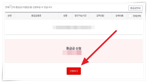 4. 그러면 환급금 종류 및 금액을 확인할 수 있는데요. "신청하기"를 클릭하면 접수를 완료할 수 있습니다.