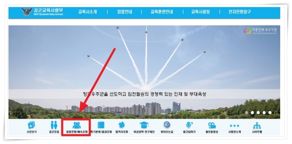 1. 공식 홈페이지 중단 메뉴에서 "입영전형/배속조회"를 클릭해 주세요.