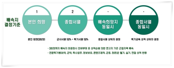 4. 배속지 결정 기준은 본인 희망, 군사서열 50%, 특기서열 50%, 종합서열 상위자 결정, 특기교육 성적 상위자 결정을 통해 정해집니다.