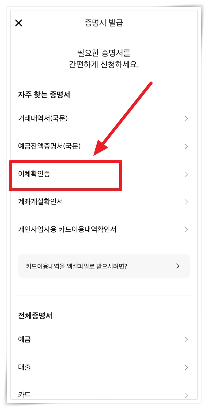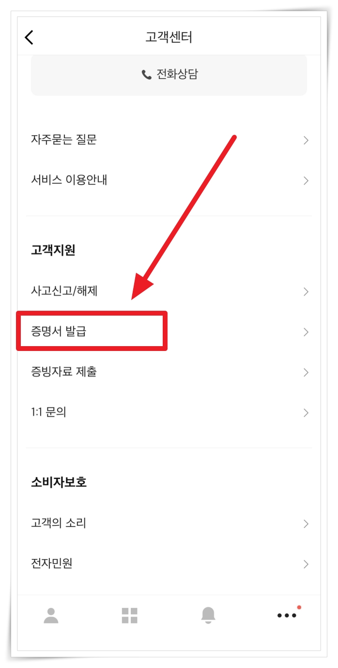 2. 고객센터에서 "증명서발급" > "이체확인증"을 클릭해 주세요.
