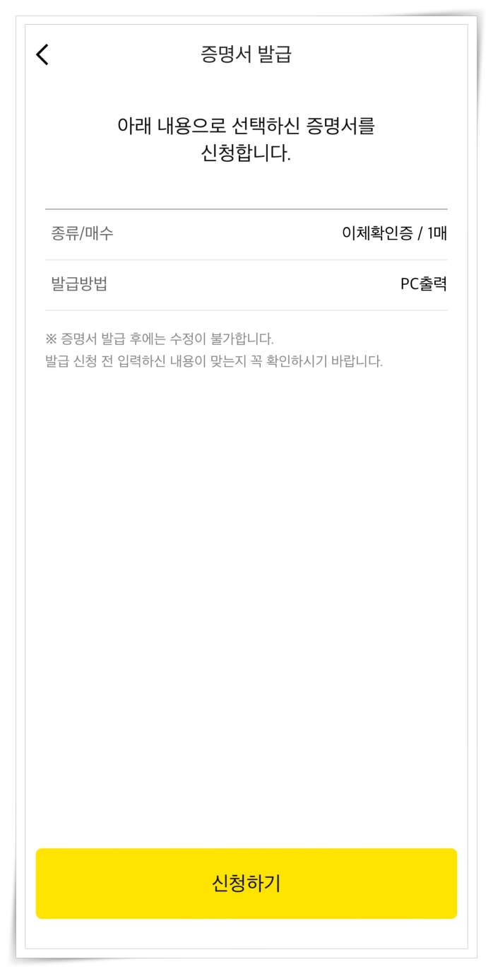 4. 발급기간 선택 후 신청하기를 클릭하면 완료하실 수 있습니다. 출력은 PC 홈페이지에서 발급내역에서 하실 수 있습니다.