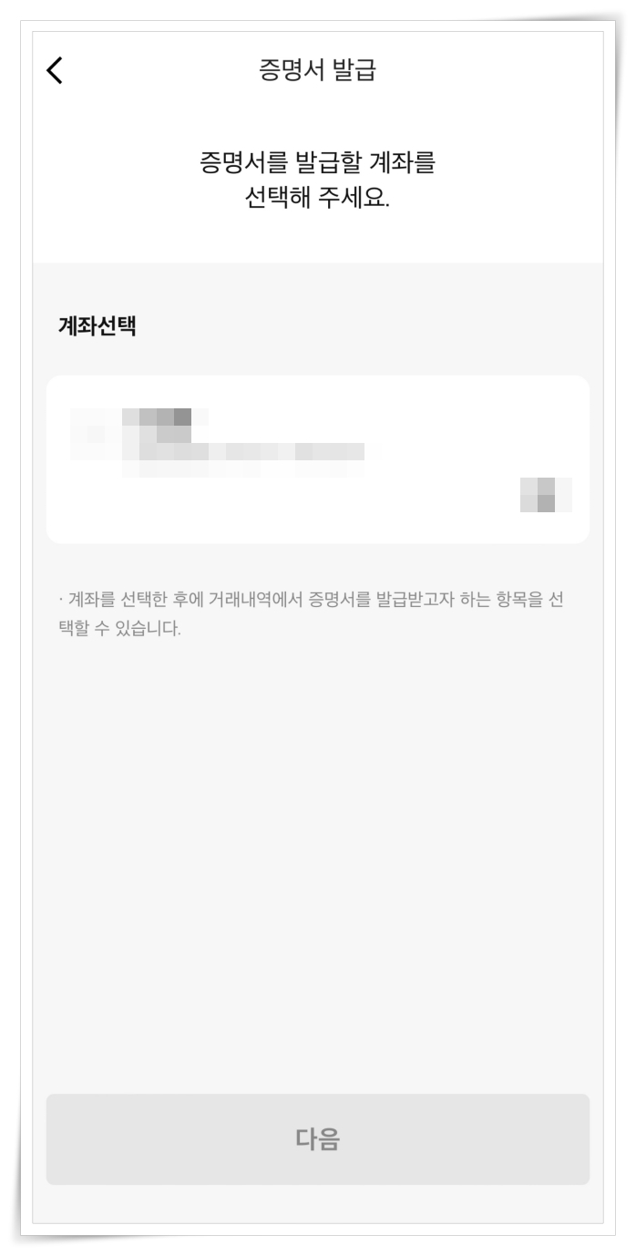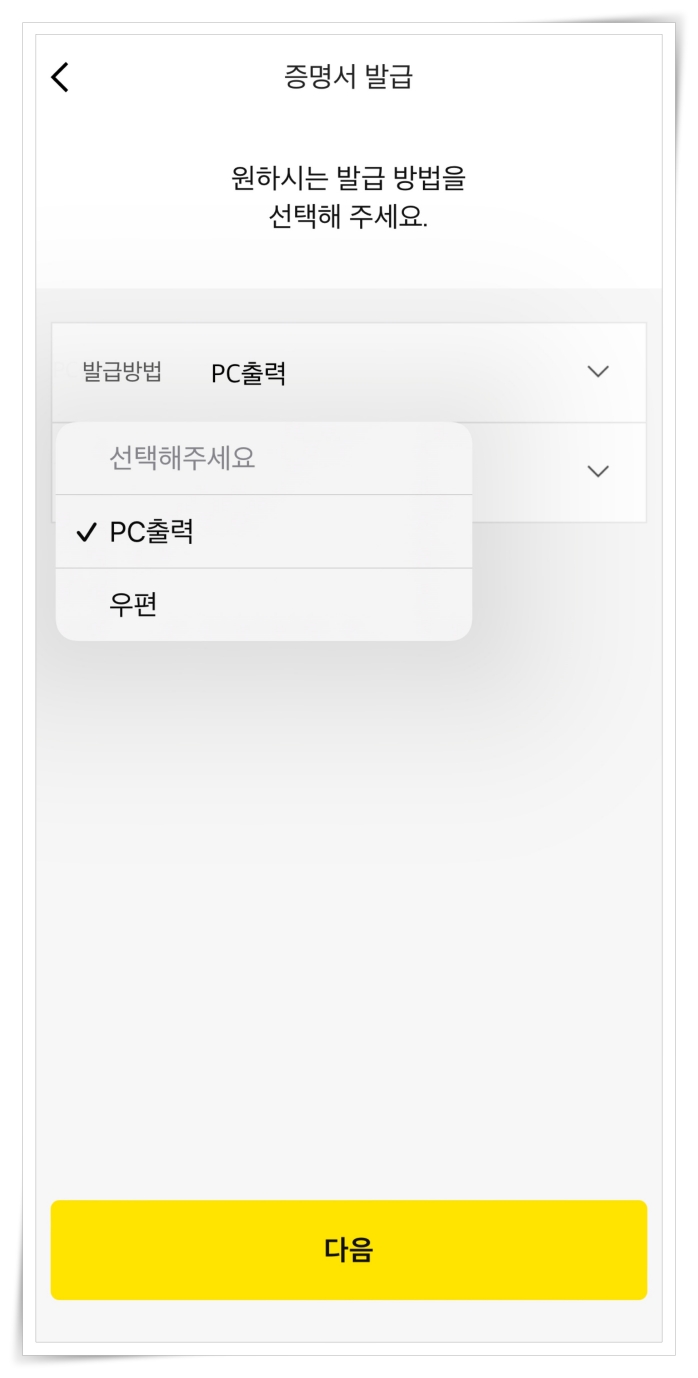 3. 발급방법에서 PC출력 또는 우편을 선택 후 계좌를 선택해 주세요.