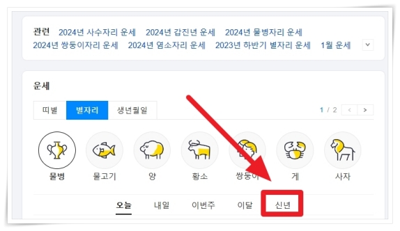 2. 자신의 별자리를 선택 후 하단 "신년" 탭을 클릭해 주세요.