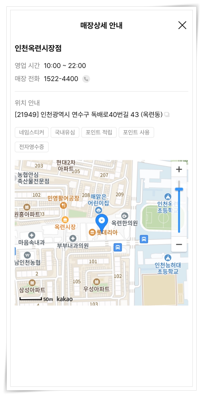 4. 해당 지점의 위치, 영업 시간, 매장 전화 등 상세 정보를 보실 수 있습니다.