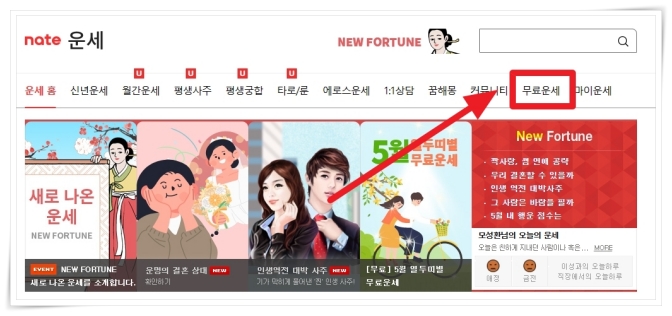 1. 홈페이지 우측 상단 메뉴에서 "무료운세"를 클릭해 주세요.