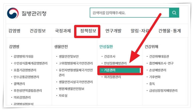 1. 홈페이지 상단 메뉴 "정책정보" > "기준관리"를 클릭해 주세요.